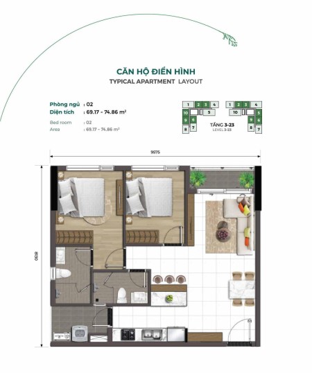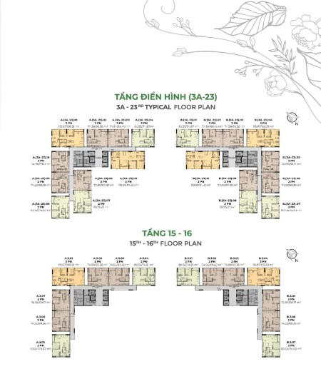 - Căn 2PN (tầng 3 - tầng 23): 73 - 81m2