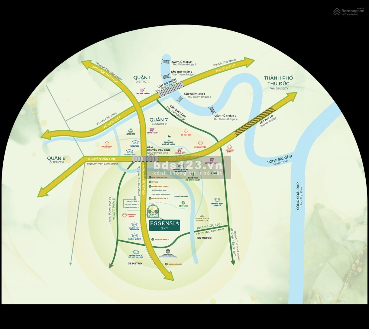 - Giáo dục: Trường Quốc tế Anh - Việt BVIS, Trường Quốc tế Canada, Hàn Quốc, Nhật Bản, Đài Loan và Nam Sài Gòn, RMIT, Trường Quốc tế Mỹ